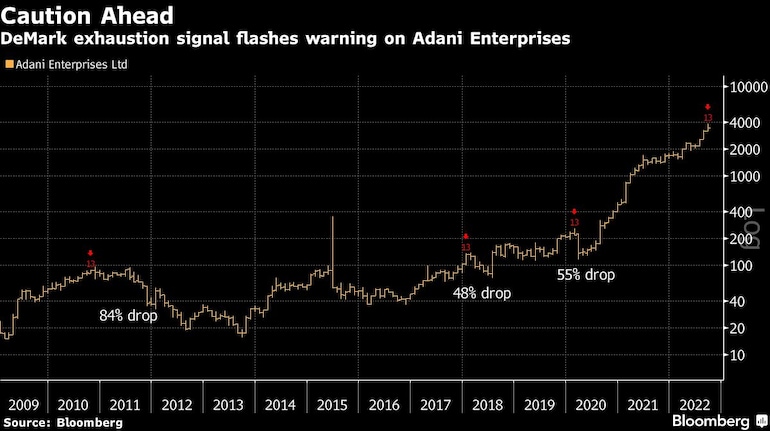 മുംബൈ: മറ്റെല്ലാ ശതകോടീശ്വരന്മാരെയും കടത്തിവെട്ടുന്ന വേഗതയില് സമ്പത്ത് വര്ധിപ്പിച്ച ഗൗതം അദാനിയും ഓഹരികളും തിരിച്ചിറക്കത്തിന്റെ പാതയിലാണെന്ന് ഡിമാര്ക്ക് സാങ്കേതിക സൂചകമായ ടിഡി സീക്വന്ഷ്യല്. ചാര്ട്ട് പാറ്റേണുകളില് പ്രയോഗിക്കുന്ന കൗണ്ടിംഗ് രീതി ഉപയോഗിച്ചാണ് പ്രവചനം. അദാനി പോര്ട്ട്സ് 2007ല് ലിസ്റ്റുചെയ്തതിന് ശേഷമുള്ള രണ്ടാമത്തെ തിരിച്ചിറക്കം നടത്തുമ്പോള് അദാനി ടോട്ടലിന്റെ തകര്ച്ച 2018 ലെ ലിസ്റ്റിംഗിനു ശേഷമുള്ള ആദ്യത്തേതാകും.