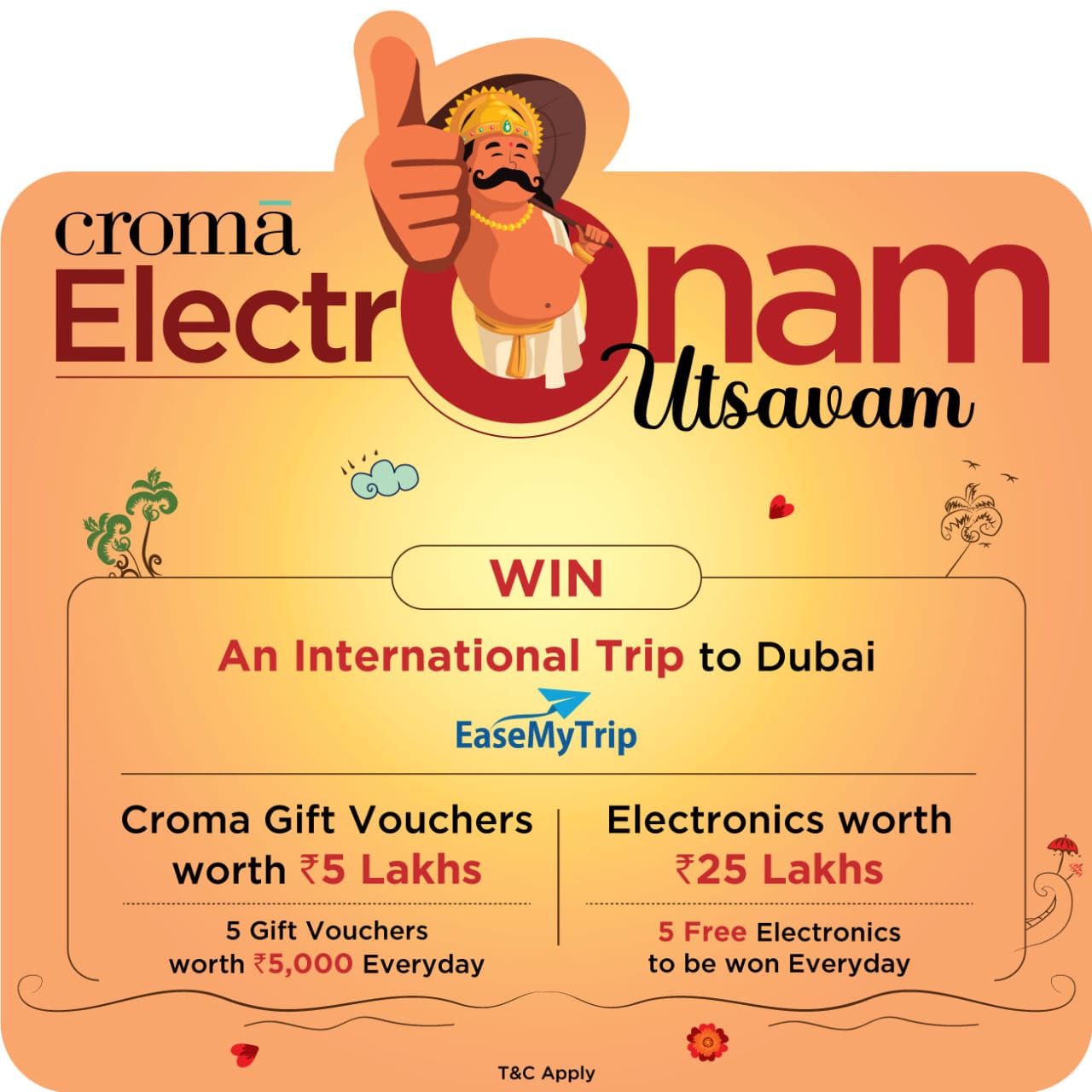 തങ്ങളുടെ ഉപഭോക്താക്കള്ക്ക് ദിവസേന ബമ്പര് സമ്മാനങ്ങള് വിജയിക്കാനുള്ള വന് അവസരവുമായാണ് കേരളത്തില് ക്രോമ ഓണത്തിന്റെ ആവേശം ആഘോഷമാക്കുന്നത്. ഈ ഉത്സവകാലത്ത് ഇലക്ട്രോണിക് ഉപകരണങ്ങള് വാങ്ങുന്ന ഉപഭോക്താക്കള്ക്ക് നറുക്കെടുപ്പില് പങ്കെടുക്കുവാന് അവസരം ലഭിക്കും.