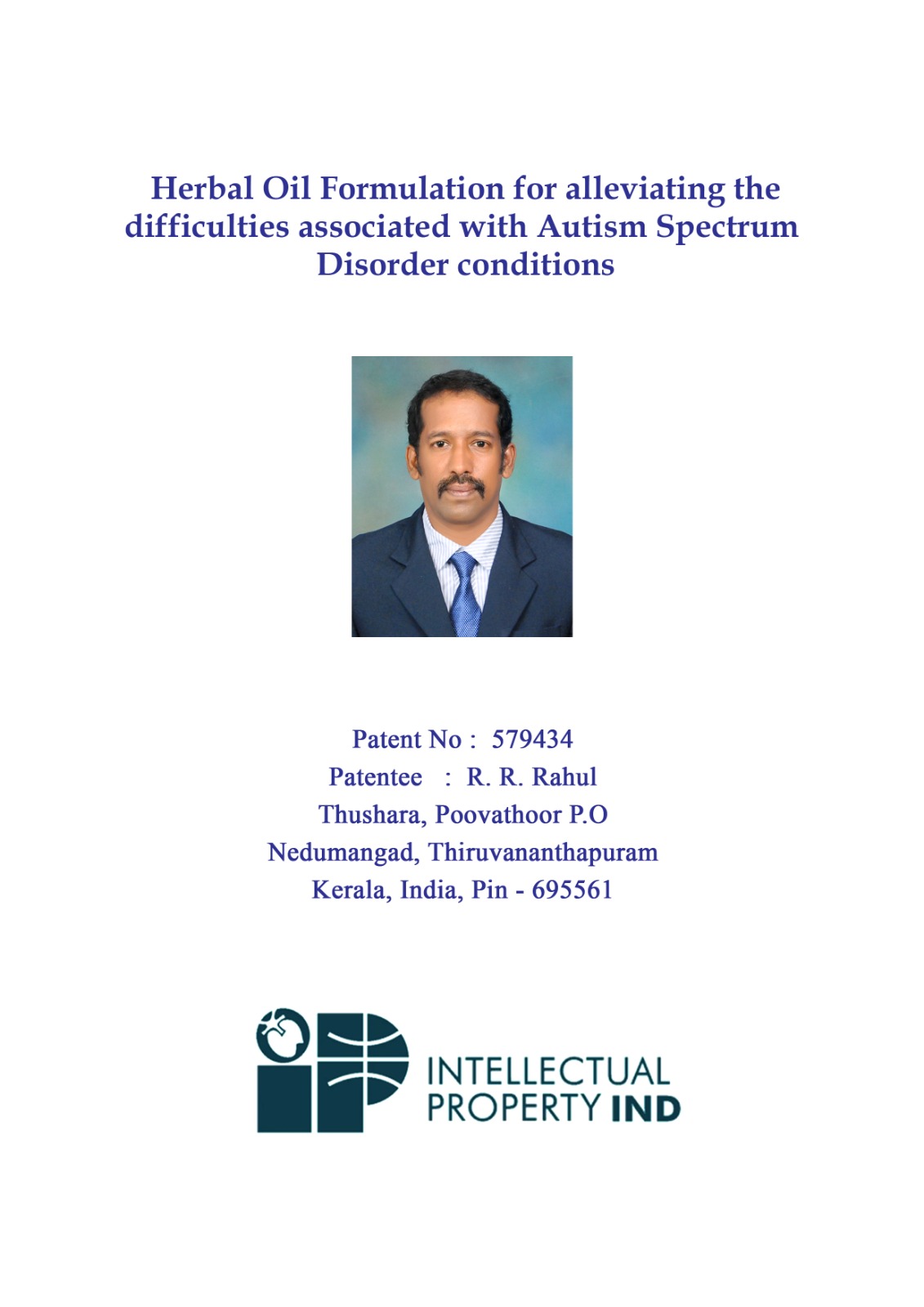 തിരുവനന്തപുരം: ഓട്ടിസം പരിചരണ രംഗത്ത് ബിസിനസ് സാധ്യതകൾ ഉയർത്തിക്കാട്ടുന്ന നേട്ടമായി, കേരളത്തിലെ ഗവേഷകനായ ആർ.ആർ. രാഹുൽ വികസിപ്പിച്ച ഹെർബൽ ഓയിൽ ഫോർമുലേഷന് ഇന്ത്യൻ പേറ്റന്റ് (നമ്പർ: 579434) ലഭിച്ചു. ശാസ്ത്രീയവും സാങ്കേതികവുമായ വിശദമായ പരിശോധനകൾക്കുശേഷമാണ് പേറ്റന്റ് അനുവദിക്കപ്പെട്ടത്.
