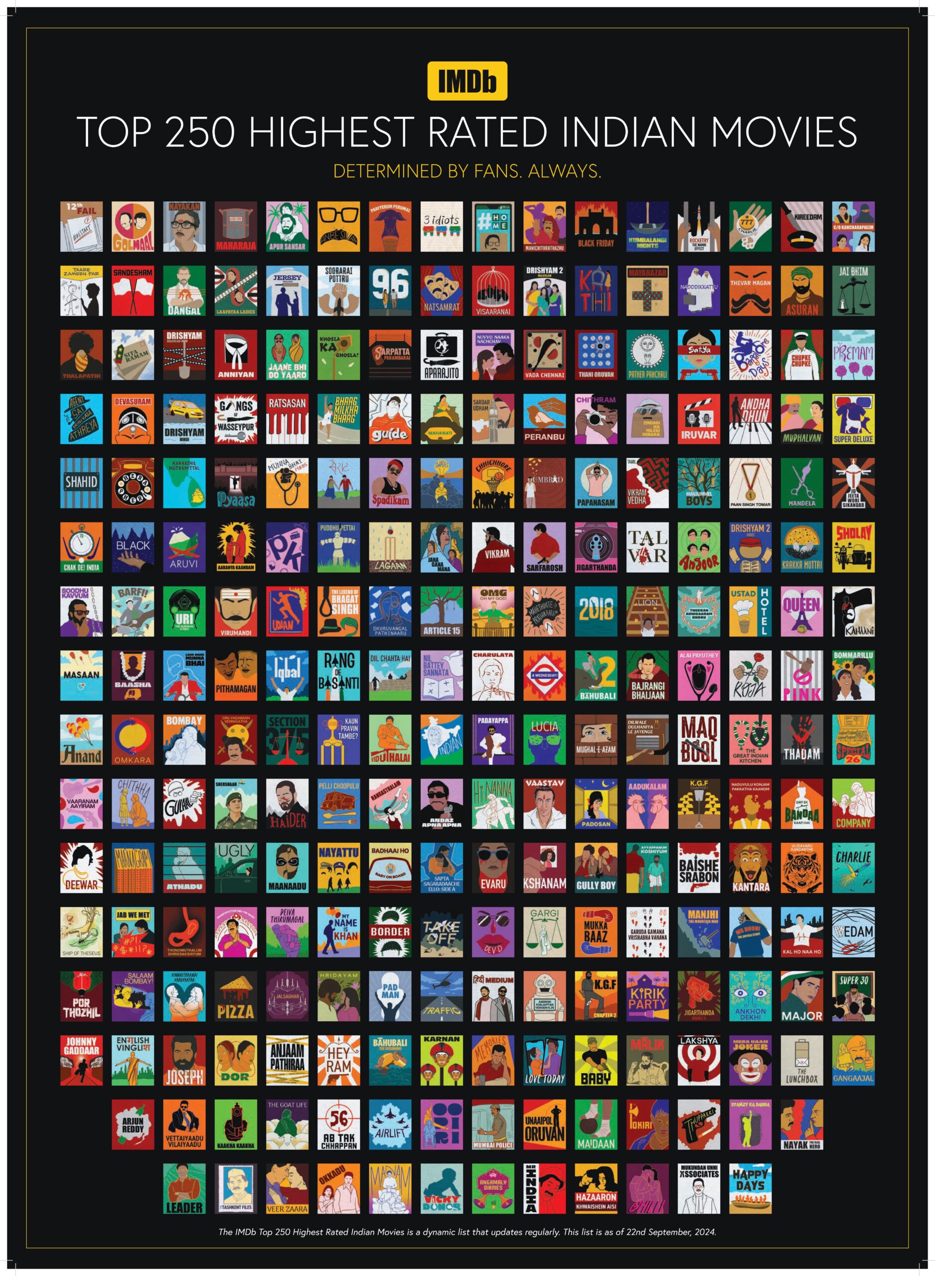 ഐഎംഡിബിയില് 8.5 മില്യണിലേറെ വോട്ടുകള് നേടിയിട്ടുള്ള 250 ചിത്രങ്ങളാണ് പട്ടികയിലുള്ളത്. നായകന്, അപുര്സന്സാര്, അന്പേശിവം, പരിയേറും പെരുമാള്, 3 ഇഡിയറ്റ്സ്, 777 ചാര്ളി, താരേ സമീര്പര്, ദംഗല് തുടങ്ങിയ ചിത്രങ്ങളാണ് ആദ്യ ഇരുപതിലുള്ളത്. സംവിധായന് മണിരത്നത്തിന്റെ 7 ചിത്രങ്ങള് പട്ടികയില് ഇടം നേടി. അനുരാഗ് കശ്വപിന്റെ 6 ചിത്രങ്ങള് പട്ടികയിലുണ്ട്.