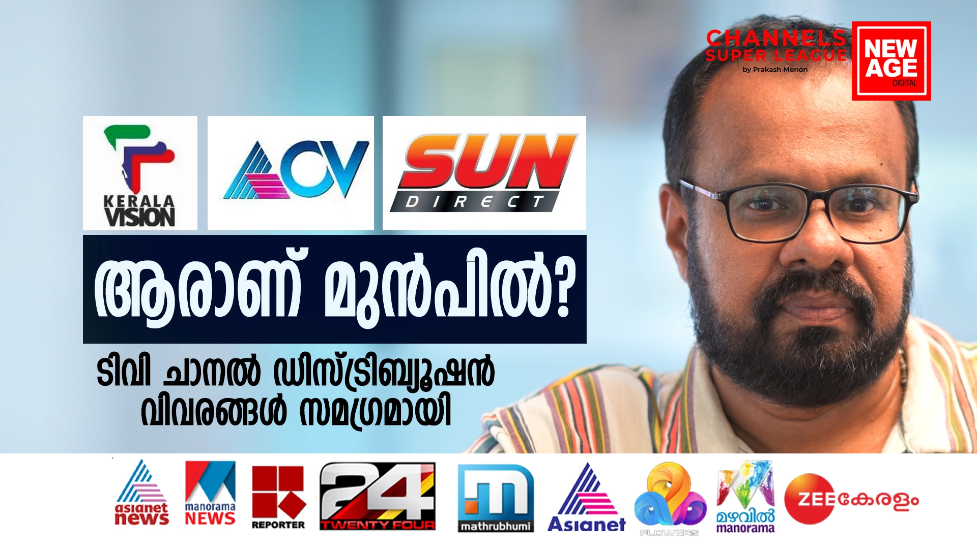 കേബിൾ നെറ്വർക്കുകളും, ഡിടിഎച്ചുകളും മത്സരിക്കുന്ന ചാനൽ ഡിസ്ട്രിബ്യൂഷൻ രംഗത്തെ ഇപ്പോഴത്തെ മേധാവിത്വം ആർക്കാണ്. കേരളത്തിലെ ഏറ്റവും പ്രചാരമുള്ള പത്രത്തേക്കാൾ വരിക്കാരുണ്ട് കേരളാ വിഷന്. തൊട്ടു പിന്നിലുള്ള എസിവിയെക്കാൾ അവർ ബഹുദൂരം മുന്നിലാണ്. സെമി അർബൻ, റൂറൽ മേഖലകളിലെ മുൻതൂക്കമാണ് അവരുടെ കരുത്ത്. സമഗ്ര വിവരങ്ങളുമായി പ്രകാശ് മേനോന്റെ വീഡിയോ കോളം- ചാനൽസ് സൂപ്പർ ലീഗ്.